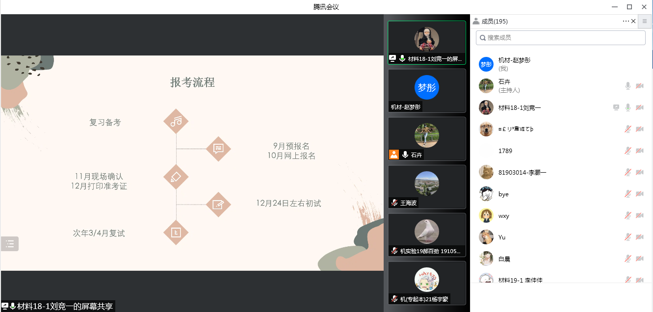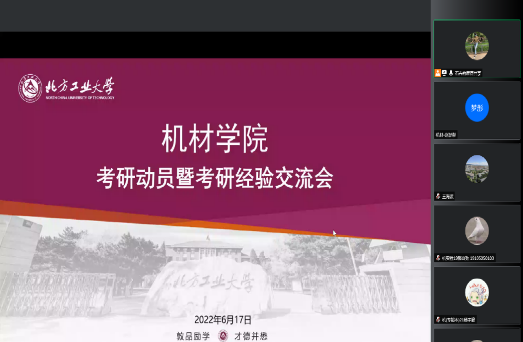 2022届考研代表围绕备考经验、院校选择和心态调整进行了分享。保研到北京科技大学的刘竞一提醒大家在考研过程中,不仅要尽早做好考研的准备,保持良好的心态,还要了解自己的兴趣爱好,正确选择专业。考上北京航空航天大学的王玉告诉同学们考研要有信心,要耐得住寂寞,要讲究复习方法,只要肯下工夫就一定可以成功。一志愿考上本校的安畅全面细致分享了考研路上的历程和经验,鼓励大家养成良好的学习习惯,根据自身情况理性地选择目标院校。考上北京工业大学的杨光勉励大家放弃舒适的生活方式,抓住机会,用努力和奋斗实现自己的价值。调剂到宁夏大学的隗丹琳从自身经验出发提醒大家学校的选择很重要,可以根据其他“上岸人”的经验,调整适合自己的专业和学校。