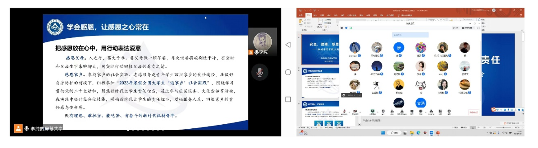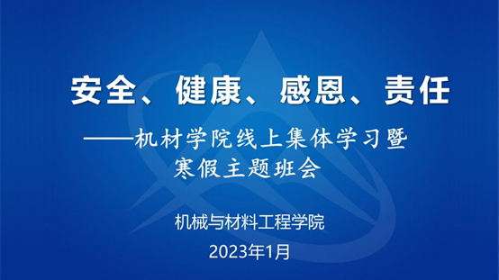 为贯彻落实学校《关于2023年元旦、寒假放假工作安排的通知》文件要求,帮助同学们合理规划大学生涯,进一步增强安全意识、底线意识,引导同学们度过一个充实又有意义的寒假。2023年1月16日至20日,best365官方网站登录入口面向全体本科生、研究生组织各班开展了以“安全、健康、感恩、责任”为主题的线上集体学习暨寒假主题班会和研究生组会,确保寒假期间学生工作开启“不断线、常更新”模式。