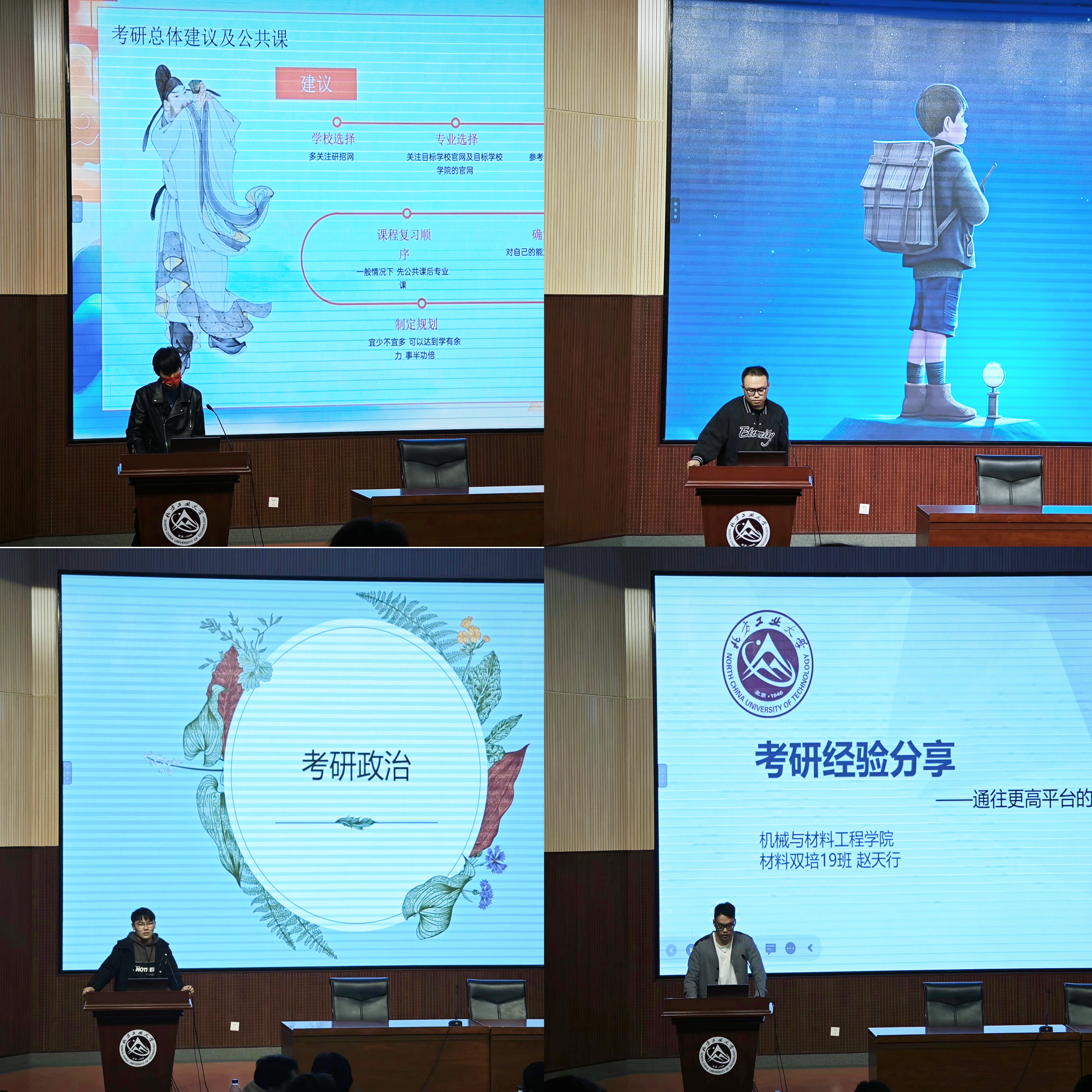 本次考研经验分享会邀请了9位来自不同专业、不同层次、不同类型的优秀学长学姐们分享经验。其中,成功考取北京工业大学的吴一鸣学长分享了考研时间线、如何择校、考研信息获取、专业课复习等方面经验;被北京科技大学录取的赵天行学长分享了考研时间分配、资料收集、心态调整等方面经验;跨专业考研的胡京伦学长从个人兴趣、专业选择、高数复习等方面进行了经验分享;调剂至桂林电子科技大学的杨方虎学长分享了复试及院校调剂等方面经验,鼓励同学们一定要主动出击、不到最后时刻绝不放弃;考取中科院的刘淳阳学姐分享了报考科研院所方面经验;来自专升本的徐贤通学长从考研总体规划及公共课复习等方面进行了经验分享,勉励专升本同学起点只代表过去;魏世博、刘希宁、田嘉辉等三名研究生学长则分享了考研政治、考研英语、专业课准备等方面经验。